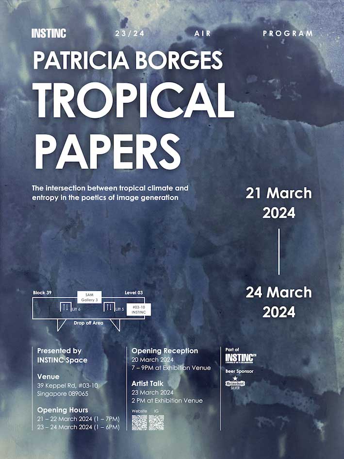 TROPICAL PAPERS is a contemporary art exhibition by Brazilian visual artist and researcher, Patricia Borges. She explores the intersection between tropical climate and entropy in the poetics of image generation. The show, presented by INSTINC, will take place from March 21st to March 24th, 2024 at the artist-run space situated in Tanjong Pagar Distripark. This exhibition results from Patricia's practical research conducted in Singapore through her participation in a three-months residency of INSTINC's 23/24 Artist-in-Residence Program, and marks a new beginning for INSTINC as it showcases the first Artist-in-Residence exhibition since its relocation.