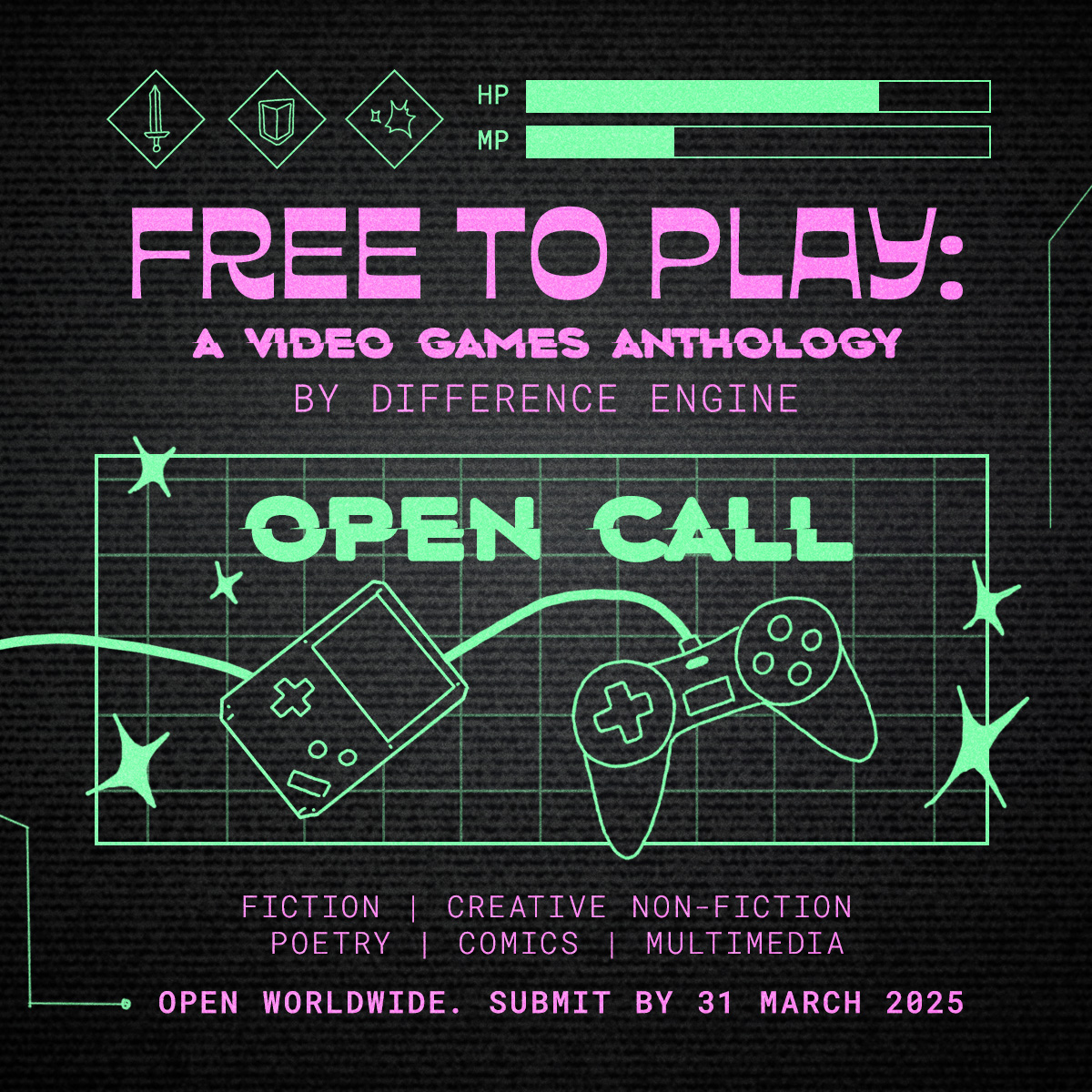 Calling all creators! Difference Engine invites you to submit pitches for our upcoming anthology "Free to Play", which will be published in 2026. Spearheaded by a dynamic team of avid gamers and multidisciplinary writers — Adan Jimenez, Daryl Lim Wei Jie, Joses Ho, and Natalie Wang — this print publication spanning fiction, creative non-fiction, poetry, comics, visual art pieces, and multimedia works will be an exciting collection that celebrates games, gaming, and play.