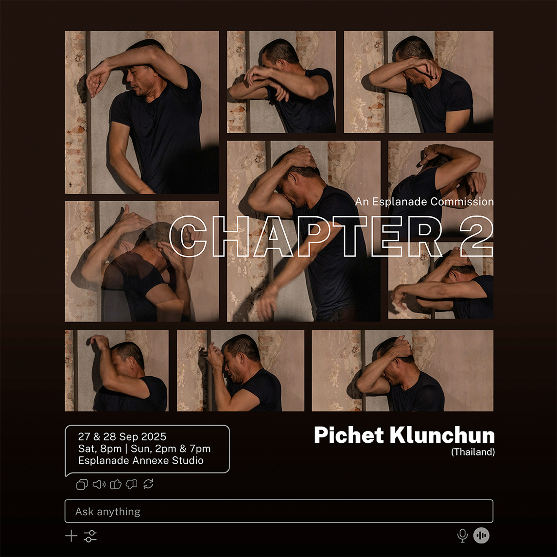 Always the provocateur, Pichet shifts from challenging tradition to confronting AI. If I AM A DEMON contests the rules of Thai classical body, Chapter 2 tests the limits of being human—particularly regarding "feeling" versus mechanical reproduction. The question "Can AI dance with feeling?" becomes a mirror that reflects back on Pichet himself: in what ways is he becoming mechanical, emotionally less human? From one who once dismantled khon, Pichet now becomes a philosopher of movement: asking how khon can survive in a new world order, and how the human body can coexist with its machinic other.