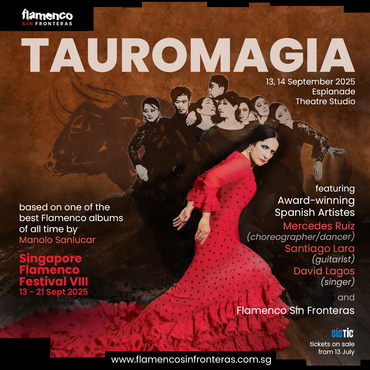 Now staging in Singapore for the very first time, Ruiz will reprise her original role and oversee the choreography and creative direction of the production. The music features original compositions by renowned composer-guitarist Santiago Lara, complemented by the soaring vocals of acclaimed flamenco singer David Lagos — paying homage to the legendary Manolo Sanlúcar, composer of the iconic flamenco album Tauromagia, from which the show draws its title and inspiration.