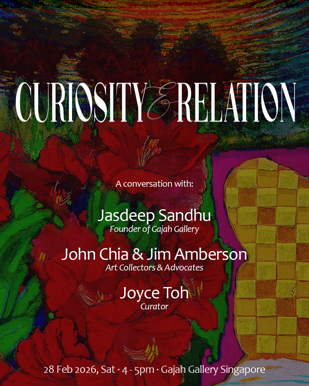 Curiosity and Relation is a special 30th anniversary panel discussion with Jasdeep Sandhu, collectors John Chia & Jim Amberson, and curator Joyce Toh.